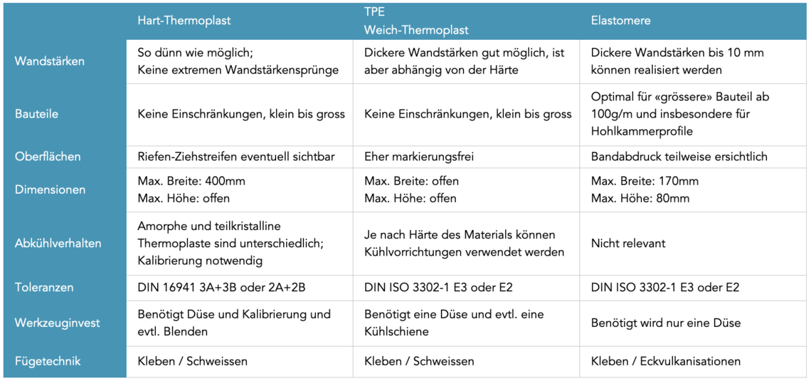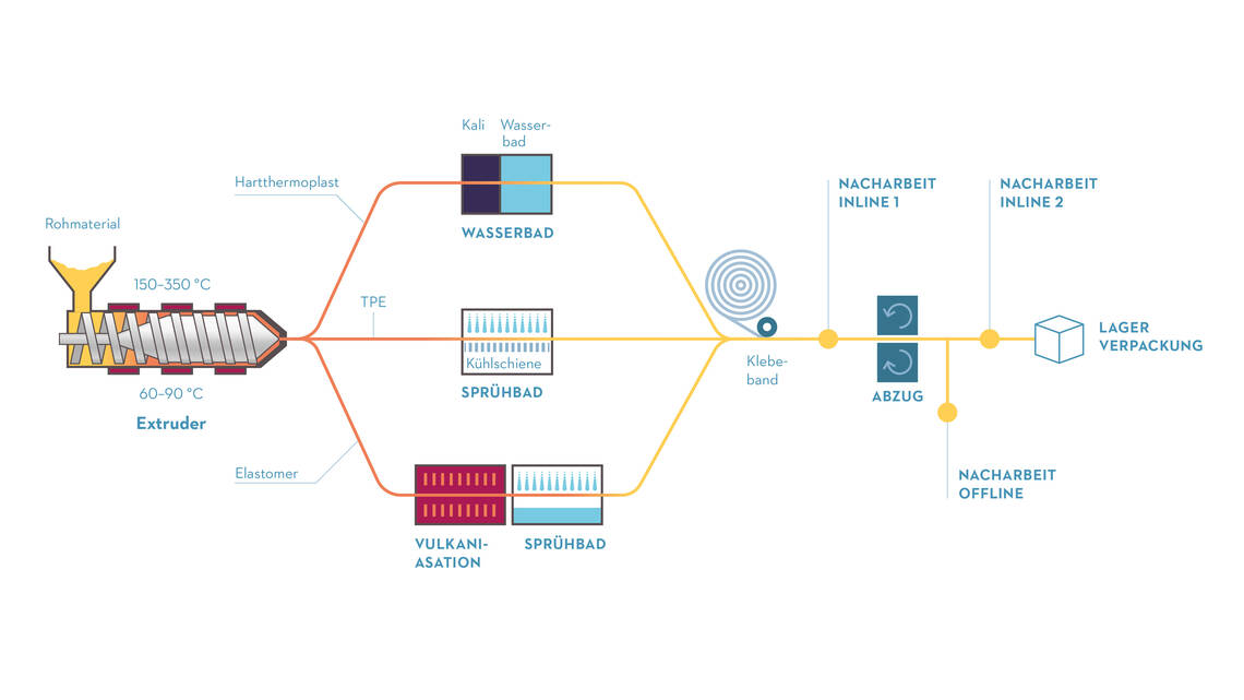 Mit dem Extrusionsverfahren lassen sich harte und weiche Thermoplaste sowie Elastomere verarbeiten. Aus den verschiedenen Kunststoffen können dabei endlose Formteile und Halbzeuge hergestellt werden. Damit die Qualität der Endprodukte unseren hohen Anforderungen entspricht, ist ein auf das Material abgestimmter Maschinenaufbau entscheidend. So kommen bei uns je nachdem ein Wasserbad, ein Sprühbad oder auch eine Vulkanisation zum Einsatz. Die folgende Übersicht zeigt Ihnen die verschiedenen Anforderungen, welche harte und weiche Thermoplaste sowie Elastomere im Herstellungsprozess mit sich bringen.